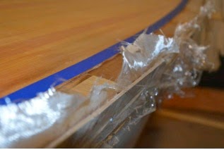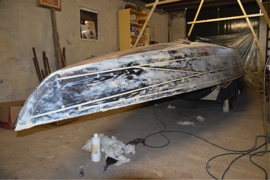 Hier ligt de boot klaar om te worden voorzien van het glasweefsel, een spannende fase van de behandeling aan de buitenzijde. Als het weefsel is aangebracht met op kleur (wit) gebrachte epoxy dan zien we pas het resultaat van het schuren en plamuren. Daarbij komt nog dat het aanbrengen van glas weefsel voor mij geen alle daags werk is dus dient van te voren goed bekeken en overlegt te worden hoe dit het beste kan gebeuren.