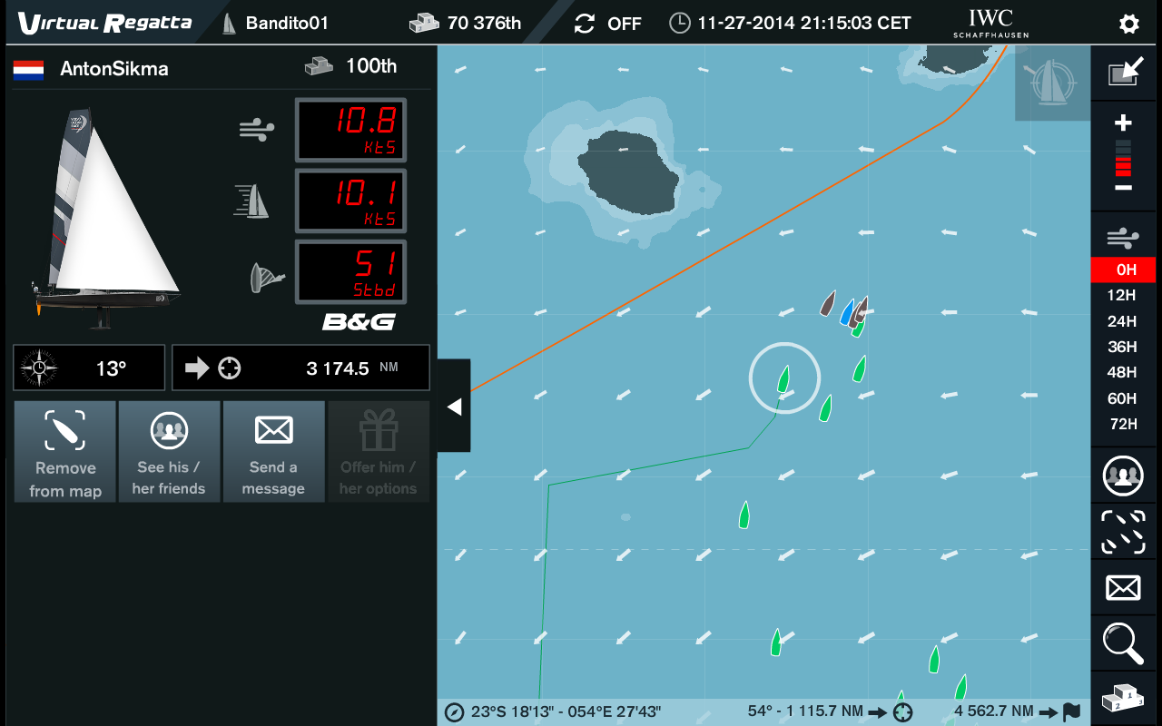 Maandag tegen de avond moest ik een keuze maken of ik naar de kust van Madagaskar zou doorvaren of oostelijk zou keren. De concurrentie voer gelijkzijdig aan mijn koers en heb toen besloten om naar de kust van Madagaskar toe te varen omdat de wind daar harder waaide. Eenmaal dinsdag morgen wakker te zijn geworden zag ik tot mijn verbazing dat dat ik op de 6e plek was beland. Vanaf dit punt steeg ik binnen het uur naar de 1e plek. Dit heb ik tot donderdag middag de 27e rond een uur of 13 volgehouden. Dit was zo’n dikke 30 uur. Een hele prestatie vond ik zelf.