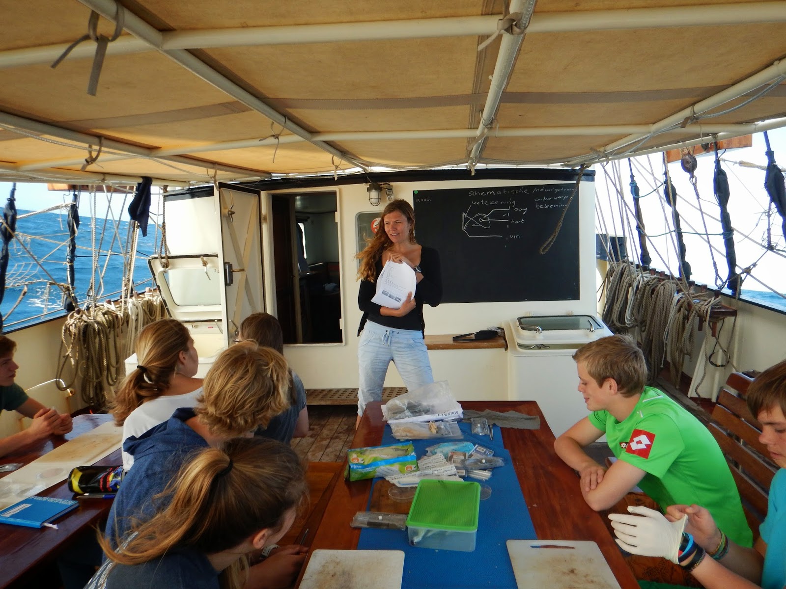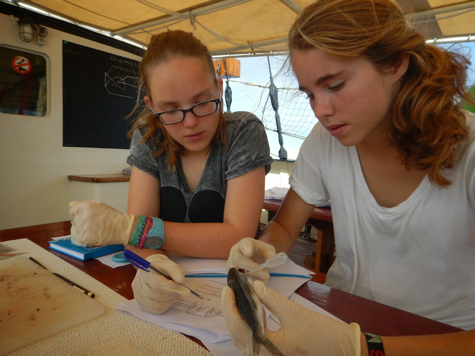 Meegaan met de School at Sea betekent onder andere dat je ‘levende’ biologieles krijgt. Dus wat je leert, mag je meteen oefenen op een vliegende vis die net aan boord gesprongen is. Sija Brinksma is hier met zo’n practische les bezig. Dit jaar vaart zij zes maanden mee met School at Sea en doet onder andere Tenerife, Panama, Cuba en de Azoren aan. Afgelopen week is ze aangekomen in de Cariben en ligt ze met de Regina Maris voor anker bij het eilandje Terre-de-Haute (Guadeloupe). Voor Zeilhelden, blogt en filmt ze haar reis.