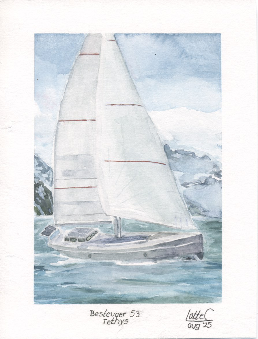 Het maken van het schilderij was nog een flinke uitdaging: ik heb maar liefst zes verschillende foto’s gecombineerd om de juiste indruk van het schip te krijgen. Tot mijn schrik ontdekte ik op het laatste moment dat de Tethys rode in plaats van blauwe strepen op de zeilen heeft… gelukkig kon ik dat nog aanpassen!